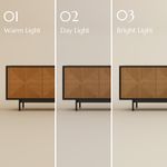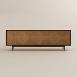 This TV stand shines with style. Its geometric patchwork combined with walnut and black hues turned out to be a classy touch. I really appreciate the material quality too. It's made with MDF and ash tambour doors — sturdy enough to last! My afternoons are now well-spent binge-watching shows comfortably.