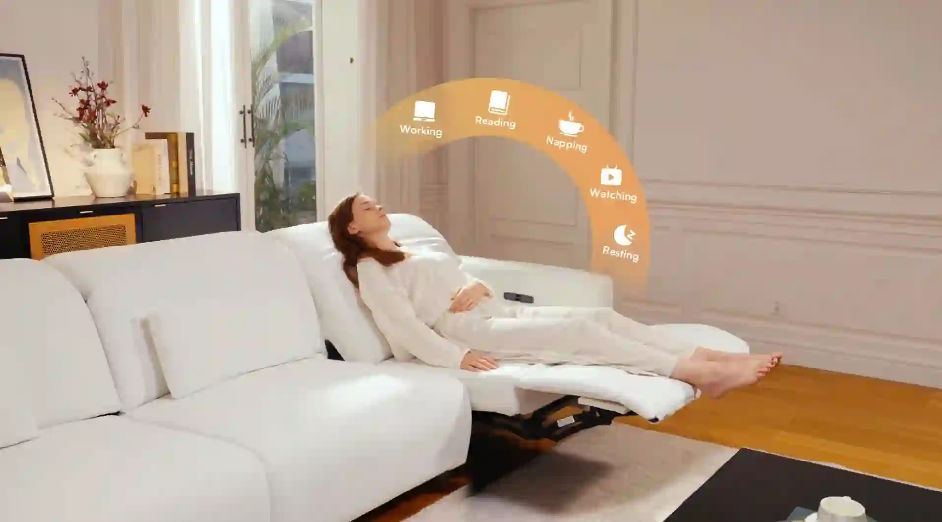 French handcrafted dual power sofa with adjustable headrest, footrest, waterproof chenille fabric, and built-in charger for smart, cloud-like comfort.